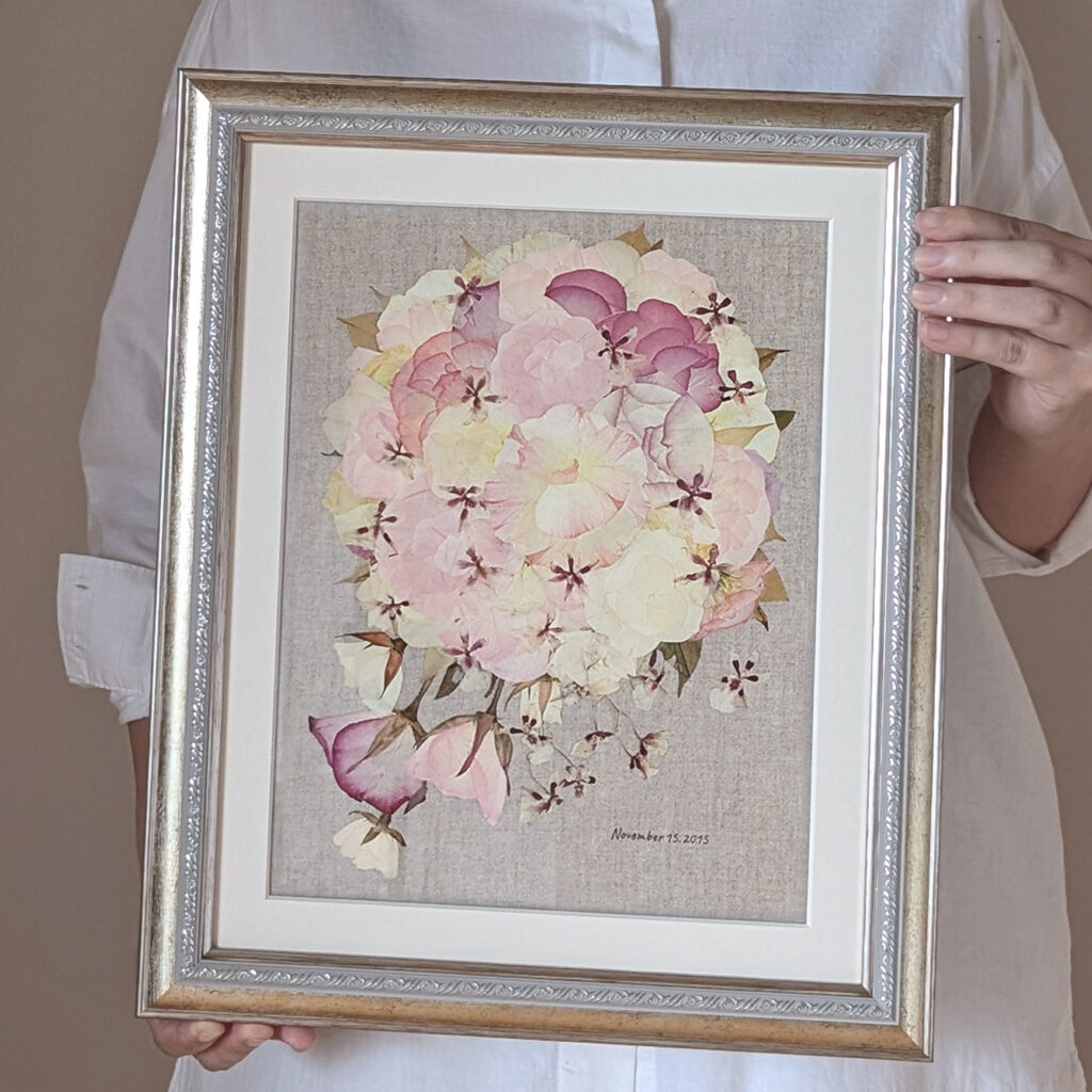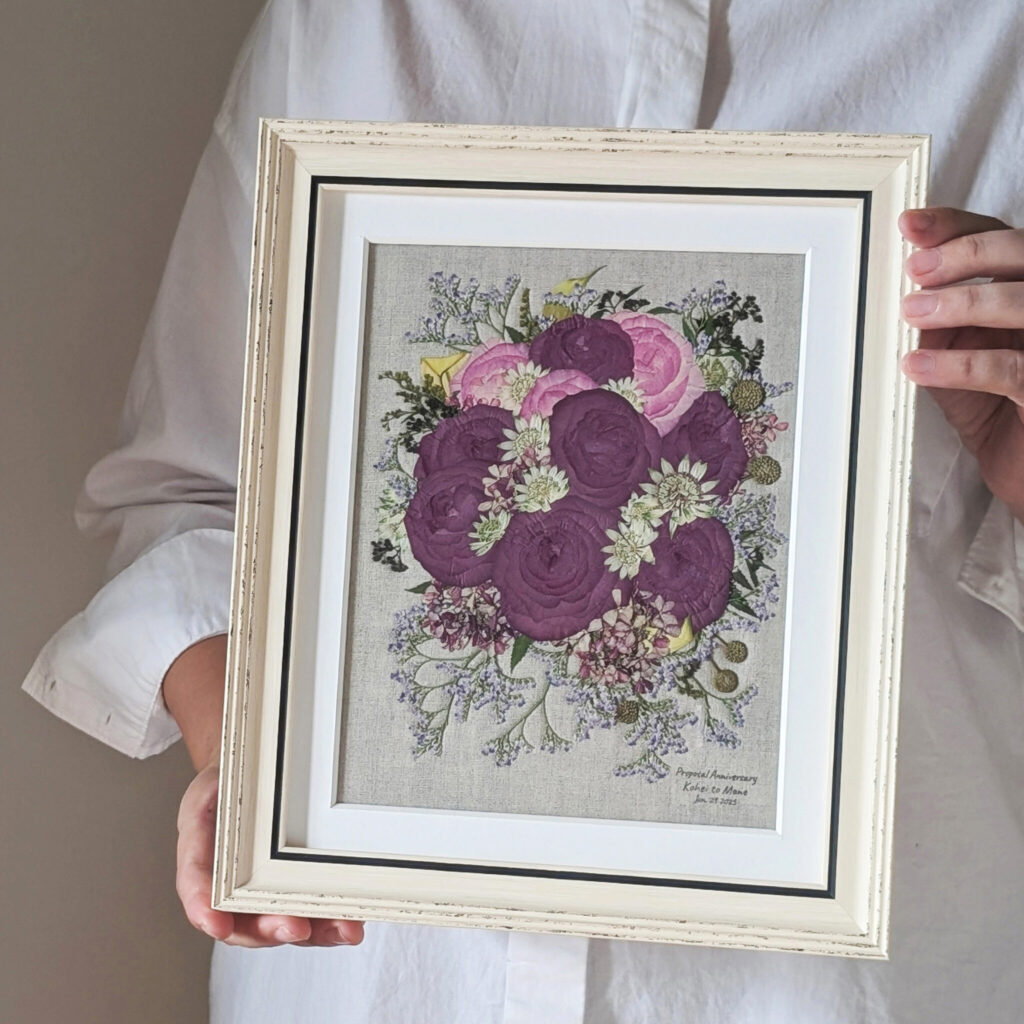 人生の特別な日に寄り添ったお花たちを、一輪一輪、想いを大切にしながら、押し花アートとして丁寧に額へお仕立てしています。